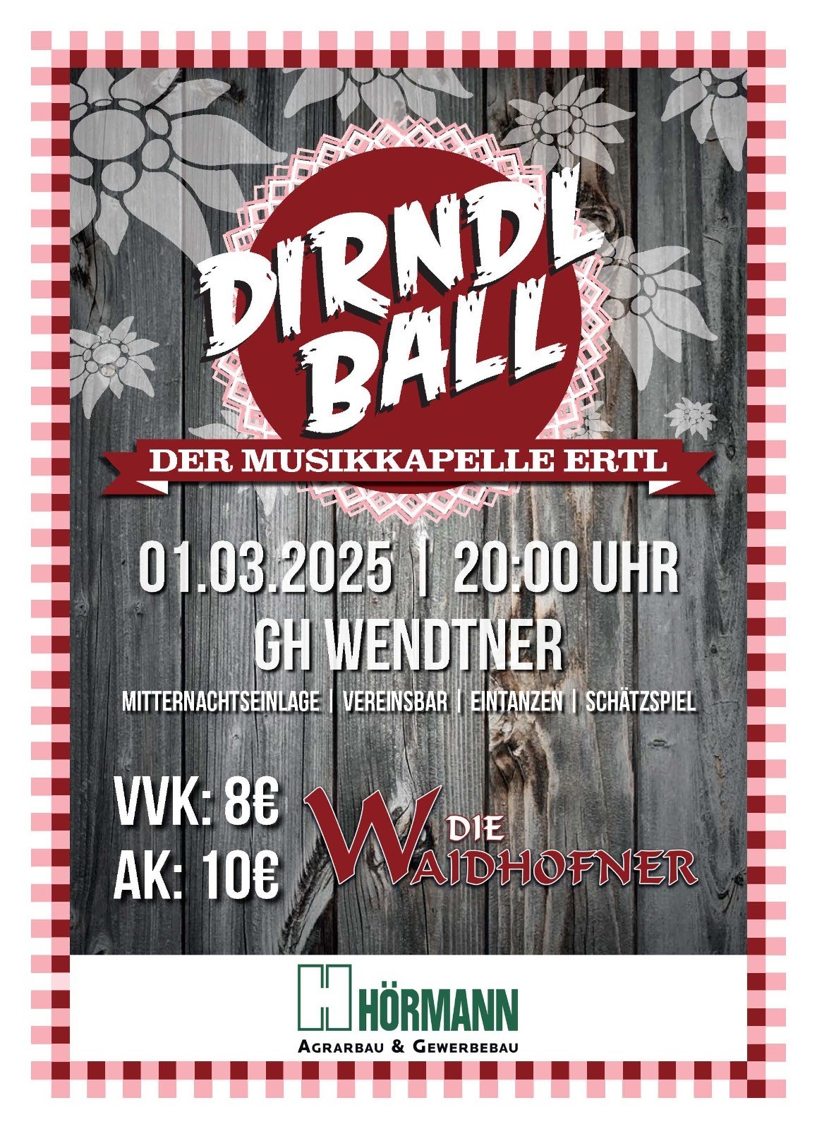 Am Faschingssamstag, dem 01. März 2025, dürfen wir wieder recht herzlich ab 20 Uhr zu unserem jährlichen Dirndlball ins Gasthaus Wendtner einladen!