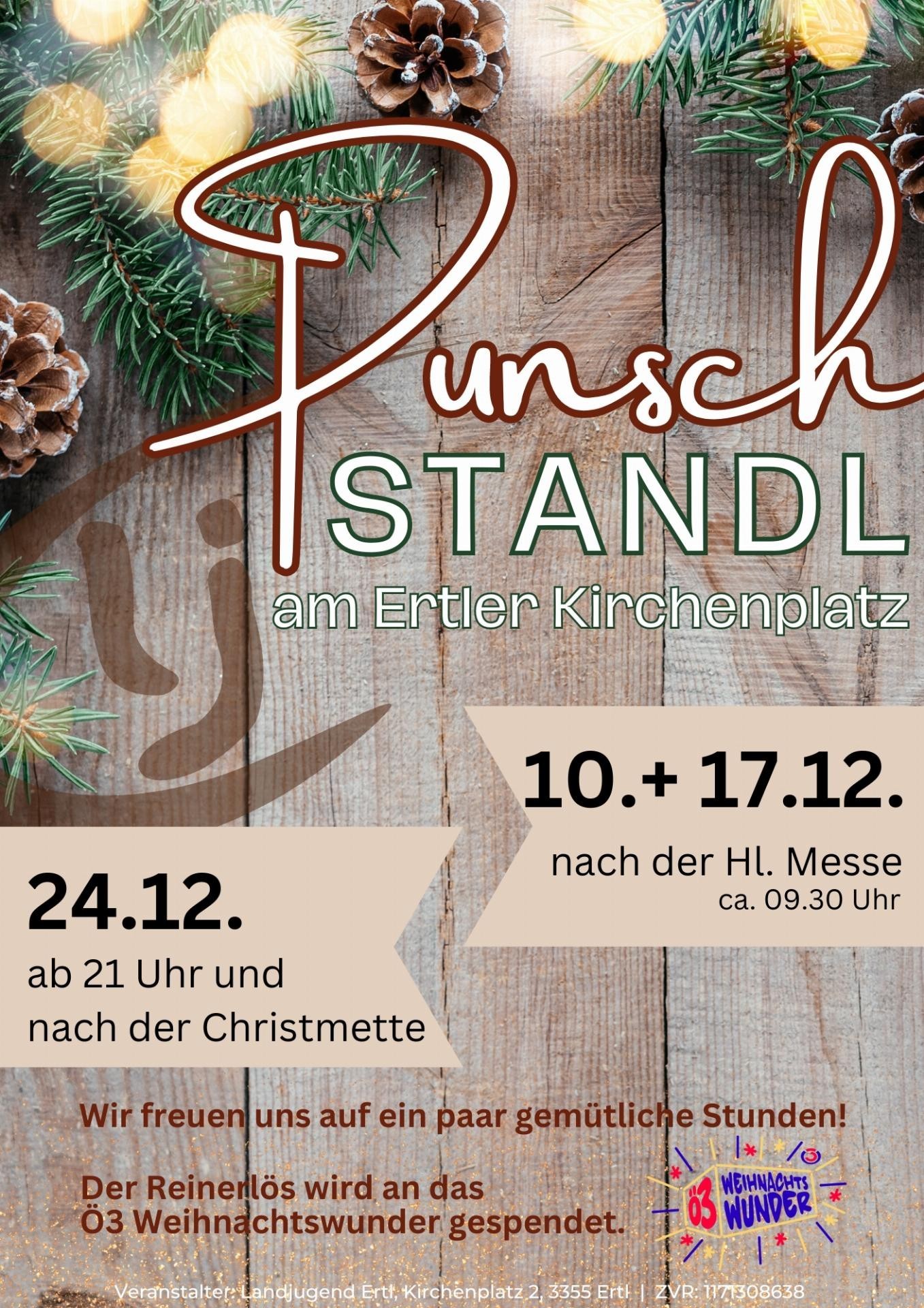Wir laden recht herzlich am 10. & 17.12. nach der Hl. Messe um ca. 09.30 Uhr und am 24.12. ab 21 Uhr, sowie nach der Christmette zum Punschstandl am Ertler Kirchenplatz ein. Der Reinerlös wird an das Ö3-Weihnachtswunder gespendet. Wir freuen uns auf ein paar gemütliche Stunden!Wir helfen Familien in Not!