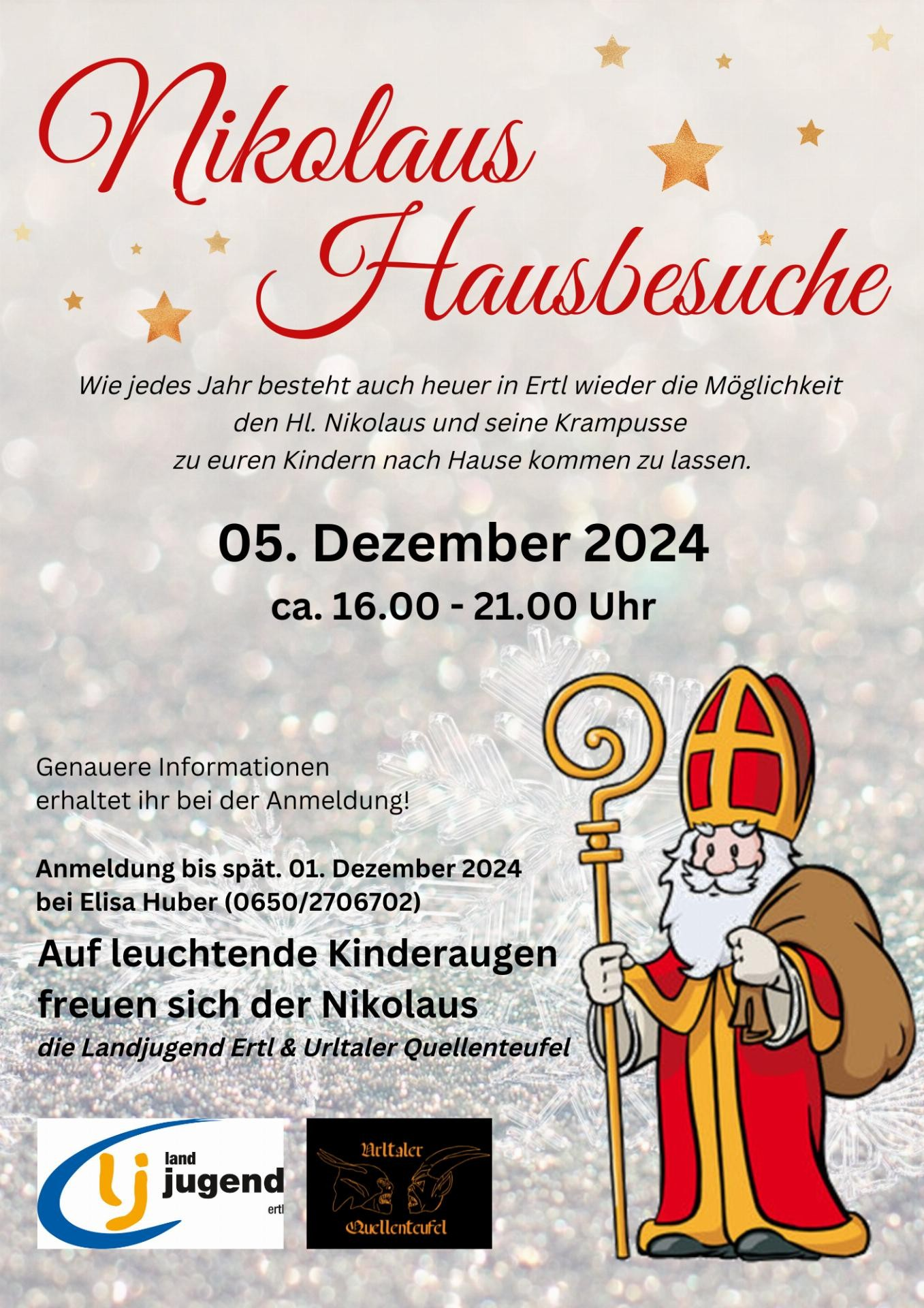 Wie jedes Jahr besteht auch heuer in Ertl wieder die Möglichkeit den Hl. Nikolaus und seine Krampusse, am 05. Dezember 2024 (zw. 16-21 Uhr) zu euren Kindern nach Hause kommen zu lassen.